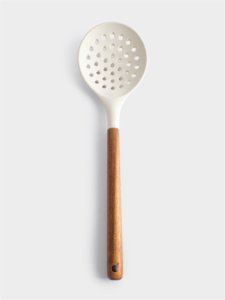Шумовка. Размер: 33х9,5 см. Материал: силикон, дерево бука, нейлон. Соответствует требованиям нормативных документов. Предназначена для доставания продуктов из воды или кипящего масла. Рекомендации по уходу: мыть вручную с применением мягких моющих средств. Не использовать для ухода абразивные чистящие средства и жесткие губки. Нельзя мыть в посудомоечной машине. Сделано в Китае.
